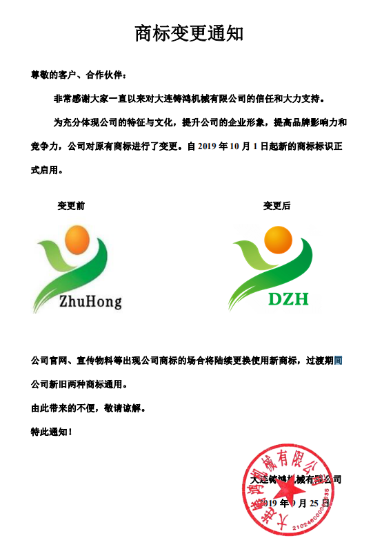 非常感謝大家一直以來(lái)對(duì)大連鑄鴻機(jī)械有限公司的信任和大力支持。為充分體現(xiàn)公司的特征與文化,提升公司的企業(yè)形象,提高品牌影響力和競(jìng)爭(zhēng)力,公司對(duì)原有商標(biāo)進(jìn)行了變更。自 2019 年 10 月 1 日起新的商標(biāo)標(biāo)識(shí)正式啟用。公司官網(wǎng)、宣傳物料等出現(xiàn)公司商標(biāo)的場(chǎng)合將陸續(xù)更換使用新商標(biāo),過(guò)渡期間公司新舊兩種商標(biāo)通用。由此帶來(lái)...