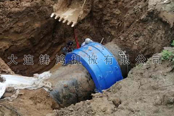 營(yíng)口地區(qū)一地下承插排水管線泄漏,DN1200,一端鋼管,一端螺旋焊管,中間有1米6高度的法蘭盤。年久管道,螺旋焊管一端有變形,并且兩個(gè)管有錯(cuò)位不同心。選擇承插口全包修補(bǔ)器,完成修復(fù)。