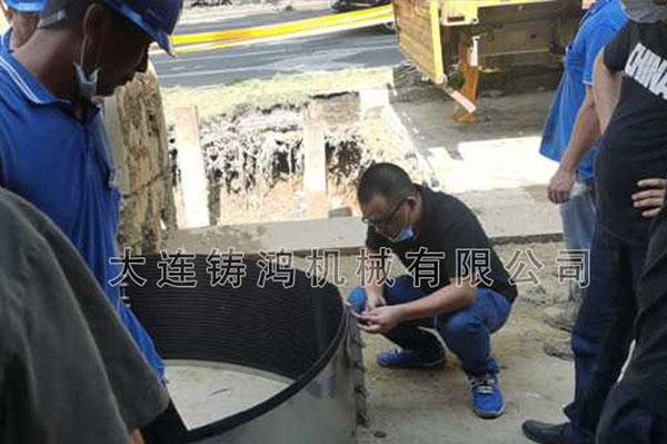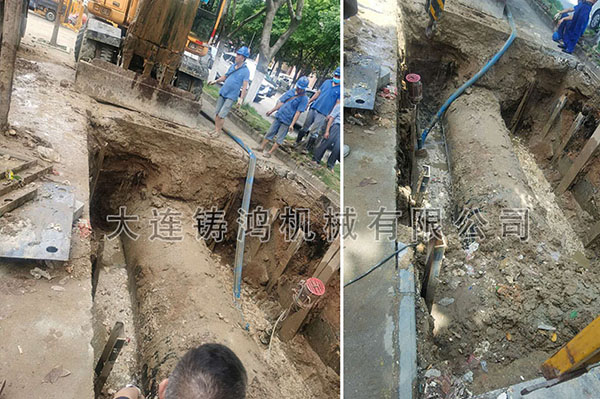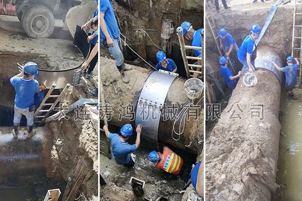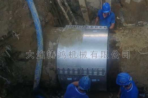 佛山市禪城區(qū)供水有限公司發(fā)現(xiàn)一處管道發(fā)生泄漏, 管道外徑1420mm,管道壓力4公斤左右,漏點10mm,管道材質(zhì)為鋼管,用鑄鴻無限延長修補器兩片長度500mm完美解決漏水問題。