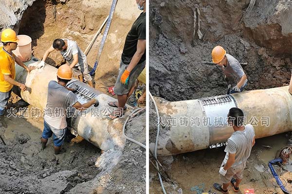 博鰲論壇期間,海南瓊海水務(wù)發(fā)現(xiàn)dn800的玻璃鋼夾砂管粘糊處發(fā)生泄露,管道漏點(diǎn)處空間狹窄,管道凹凸不平,修補(bǔ)起來較為棘手,由于現(xiàn)場不能停水,不能使用粘糊方式進(jìn)行修復(fù),選擇備貨的管道修補(bǔ)器修補(bǔ),由于沒有相應(yīng)外徑產(chǎn)品備貨。簡單處理后,使用萬能片無限延長修補(bǔ)器快速搭接出管徑,完成修補(bǔ)。