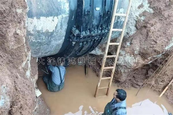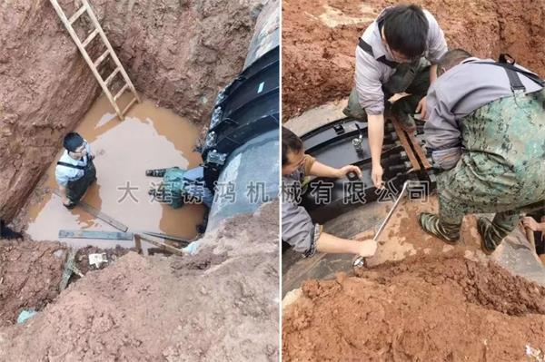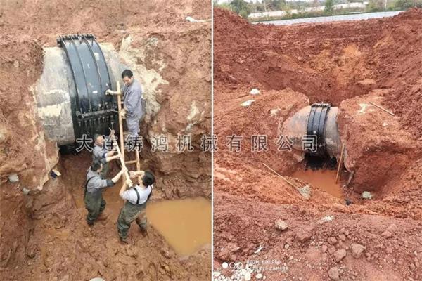 福建東南水務(wù)DN2200的球墨鑄鐵管發(fā)生泄漏,漏點(diǎn)在承插口處,由于安裝鑄管的時(shí)候因?yàn)榈鼗鲁猎斐纱娇谛孤?,管道?0~50mm的變形,此處管道為主管道,不能停水,使用4片的2米2 的承插口管道修補(bǔ)器進(jìn)行修復(fù),1小時(shí)完成安裝,不再泄漏。