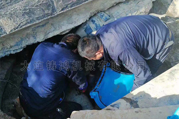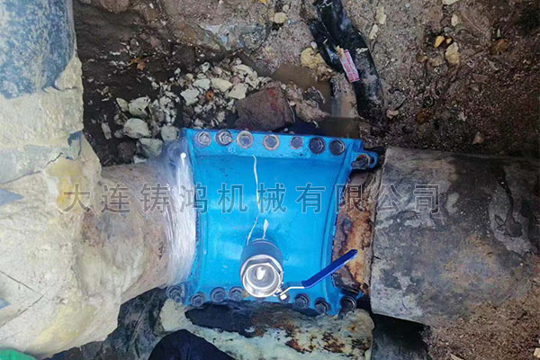 大石橋熱力公司DN250球墨鑄鐵管彎頭處底部發(fā)生泄露,面有腐蝕,工況緊急,現(xiàn)場(chǎng)不能停水,現(xiàn)場(chǎng)施工作業(yè)面積狹窄,管道和管道之間距離離得比較近,因?yàn)檎倒┡冢允褂描T鴻全包彎頭修補(bǔ)器快速修補(bǔ)該處漏點(diǎn)。