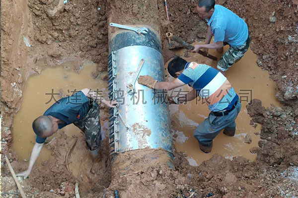 云南曲靖水務(wù)dn600的球墨鑄鐵管道發(fā)生泄漏,管道被擠壓變形,變形長度有60多公分,漏點(diǎn)長度有40多公分,壓力12公斤左右,使用一米二長的板式修補(bǔ)器進(jìn)行修復(fù),不到一個小時就安裝成功。