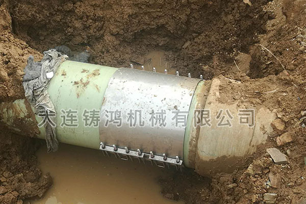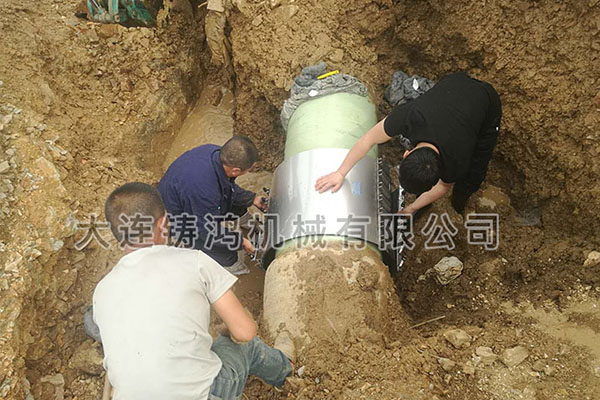 大連某工地玻璃鋼污水管道在施工過程中讓挖掘機(jī)把管道挖壞,施工現(xiàn)場(chǎng)環(huán)境全是水,所以先進(jìn)行排水作業(yè),清除污水后,發(fā)現(xiàn)620玻璃鋼管發(fā)生泄漏,漏點(diǎn)漏洞有將近一拳頭大,根據(jù)現(xiàn)場(chǎng)工況,傳統(tǒng)修補(bǔ)方式必須停水停壓,晾干,沾糊,現(xiàn)場(chǎng)不能停水停壓,使用鑄鴻板式修補(bǔ)器615-635規(guī)格進(jìn)行快速帶壓修補(bǔ),用時(shí)8分鐘完成修復(fù),現(xiàn)場(chǎng)領(lǐng)導(dǎo)非常滿意。