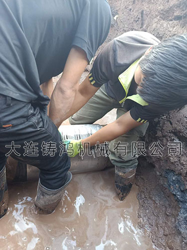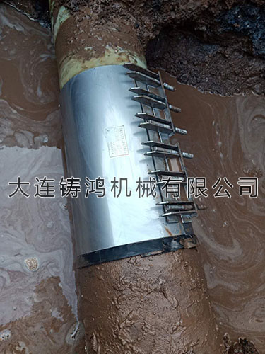 由于現(xiàn)場情況緊急,需要馬上恢復(fù),但是需要修補(bǔ)的管徑?jīng)]在315-325這個范圍內(nèi),我司建議客戶在漏點(diǎn)位置墊一塊膠皮或者鋼板,再安裝修補(bǔ)器,保證管道堵漏后的密封效果。
