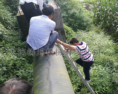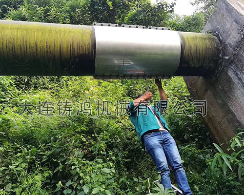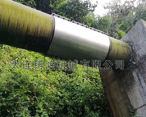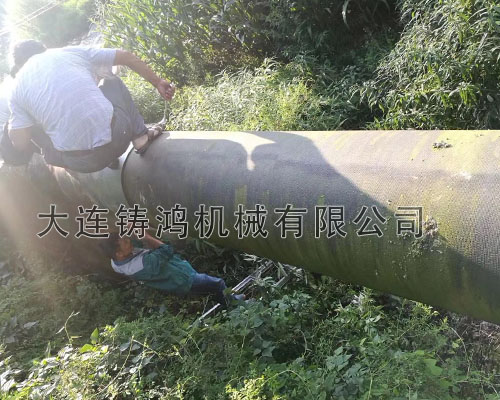 DN600的球墨鑄鐵管道被落石砸中,管道發(fā)生泄漏并在漏點(diǎn)處伴有嚴(yán)重的管道變形,長度達(dá)800mm,由于是架空管道,管離地面8米左右,所以需要采取較為方便的修補(bǔ)方式,降低作業(yè)的危險性,最終選擇了“鑄鴻”板式修補(bǔ)器進(jìn)行快速修復(fù),降低作業(yè)難度。